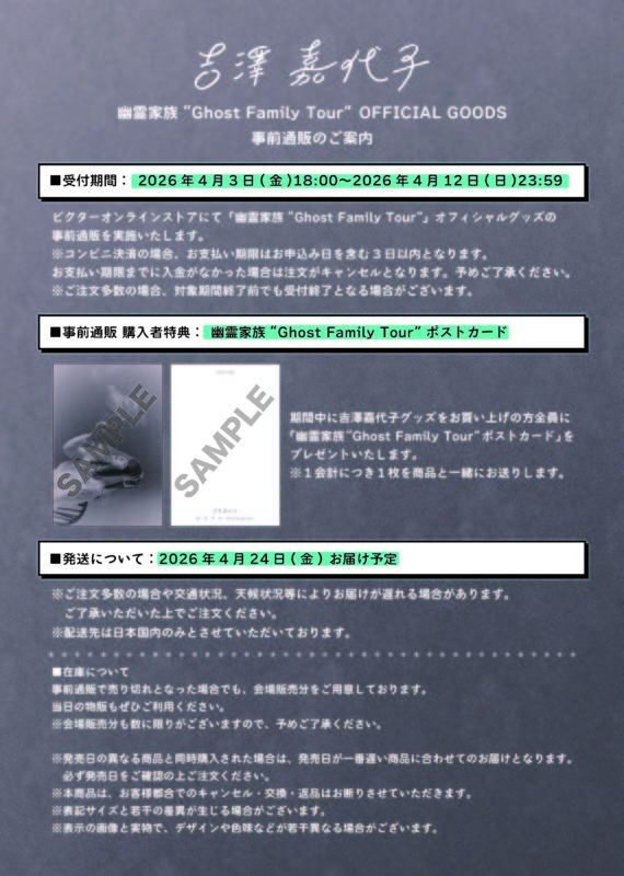 期間中に吉澤代子グッズをお買い上げの方全員に「幽霊家族”Ghost Family Tour”ポストカード」をプレゼントいたします。
